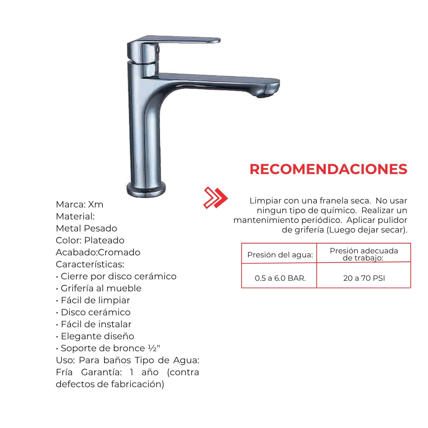 Fabricada en metal pesado, esta grifería garantiza alta durabilidad y excelente rendimiento. Su sistema de cierre por disco cerámico permite un control suave del agua, evitando fugas y asegurando una larga vida útil.