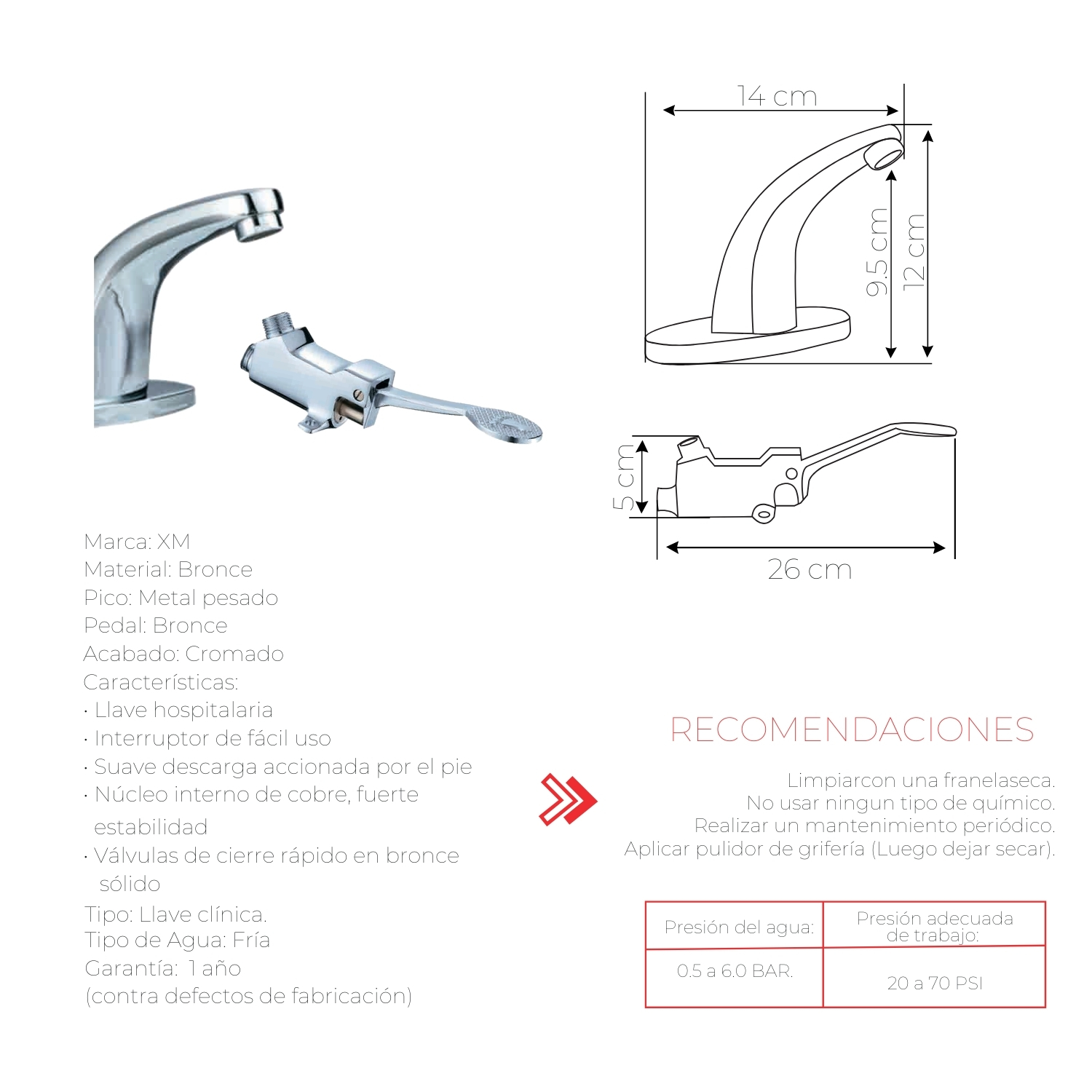 Esta llave hospitalaria con pedal está diseñada para cumplir con los más altos estándares de durabilidad, higiene y facilidad de uso en hospitales, clínicas, laboratorios y centros de salud.