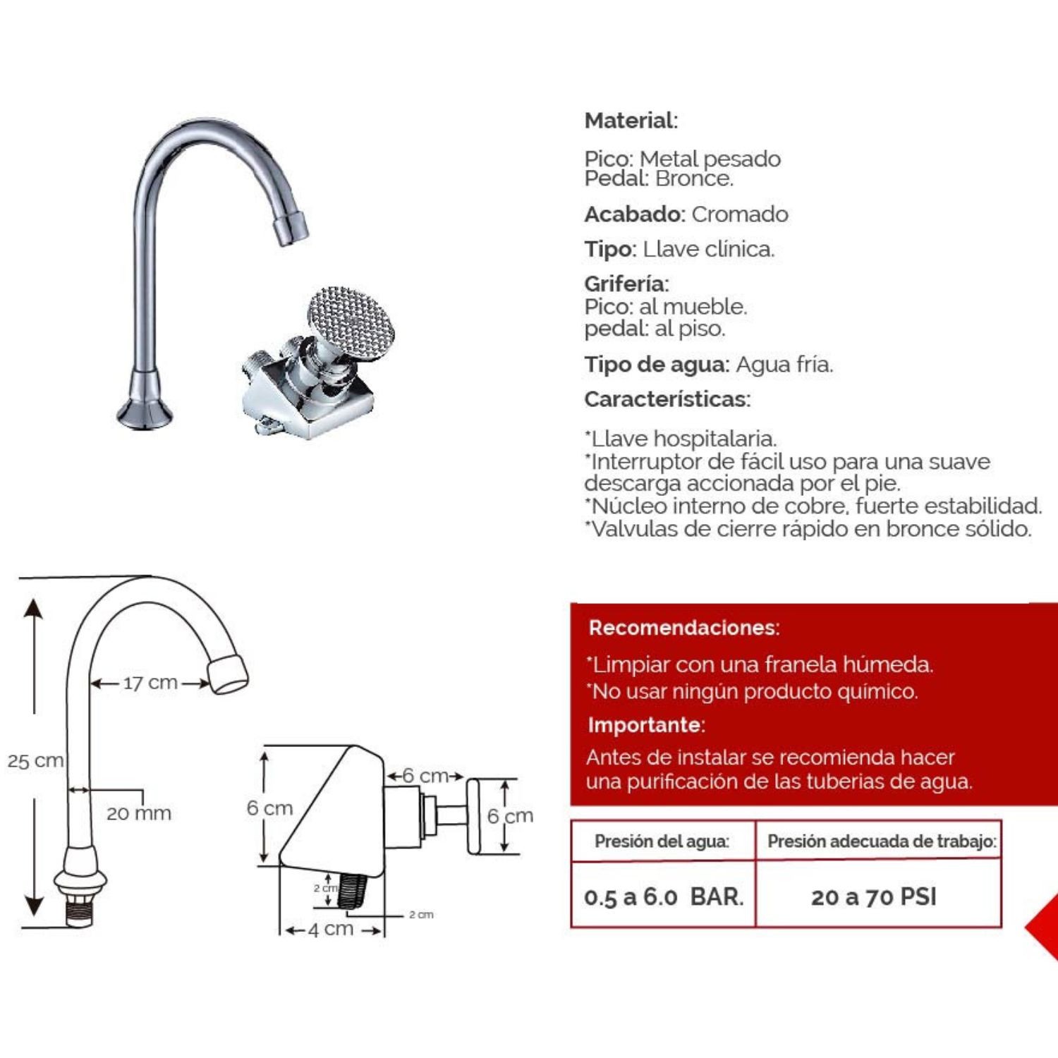 Diseñada especialmente para entornos hospitalarios y clínicos, esta grifería combina resistencia, higiene y practicidad. Su sistema de accionamiento por pedal garantiza un uso sin contacto manual, reduciendo riesgos de contaminación y ofreciendo un flujo de agua controlado y seguro.