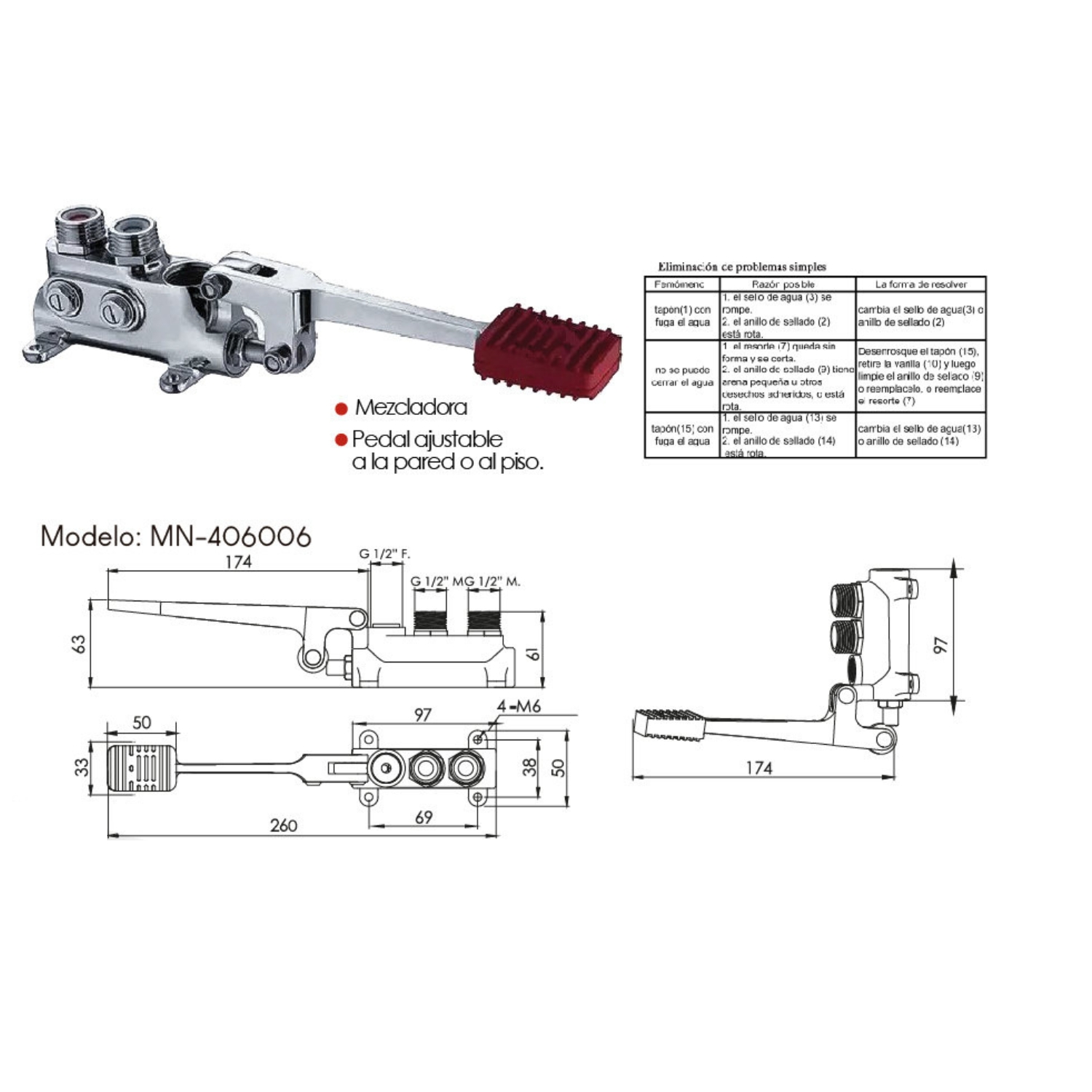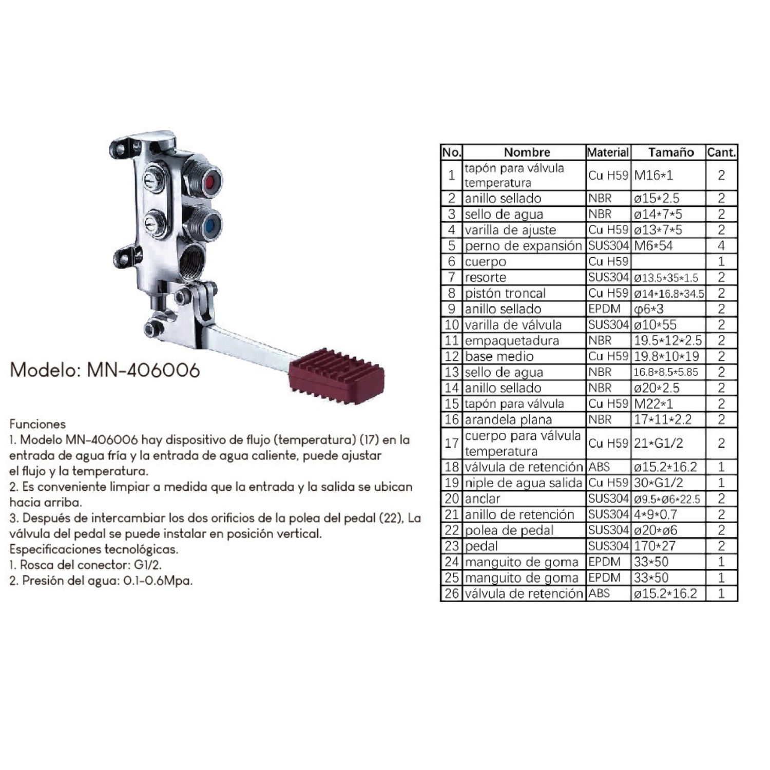 Este Modelo es una grifería a pedal diseñada para brindar higiene, comodidad y control en el uso de agua fría y caliente. Su sistema permite regular tanto el flujo como la temperatura de manera sencilla, evitando el contacto manual y reduciendo el riesgo de contaminación.