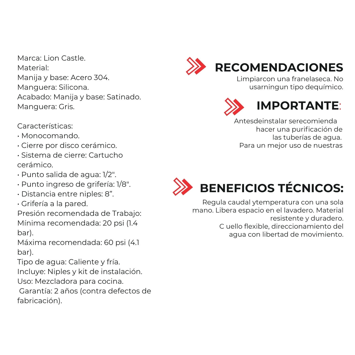 Equipada con un sistema monocomando, permite regular fácilmente el caudal y la temperatura del agua con una sola mano, brindando mayor comodidad en el uso diario. Su cuello flexible de silicona en color gris ofrece libertad de movimiento, facilitando la limpieza de utensilios y el alcance en diferentes áreas del lavadero.