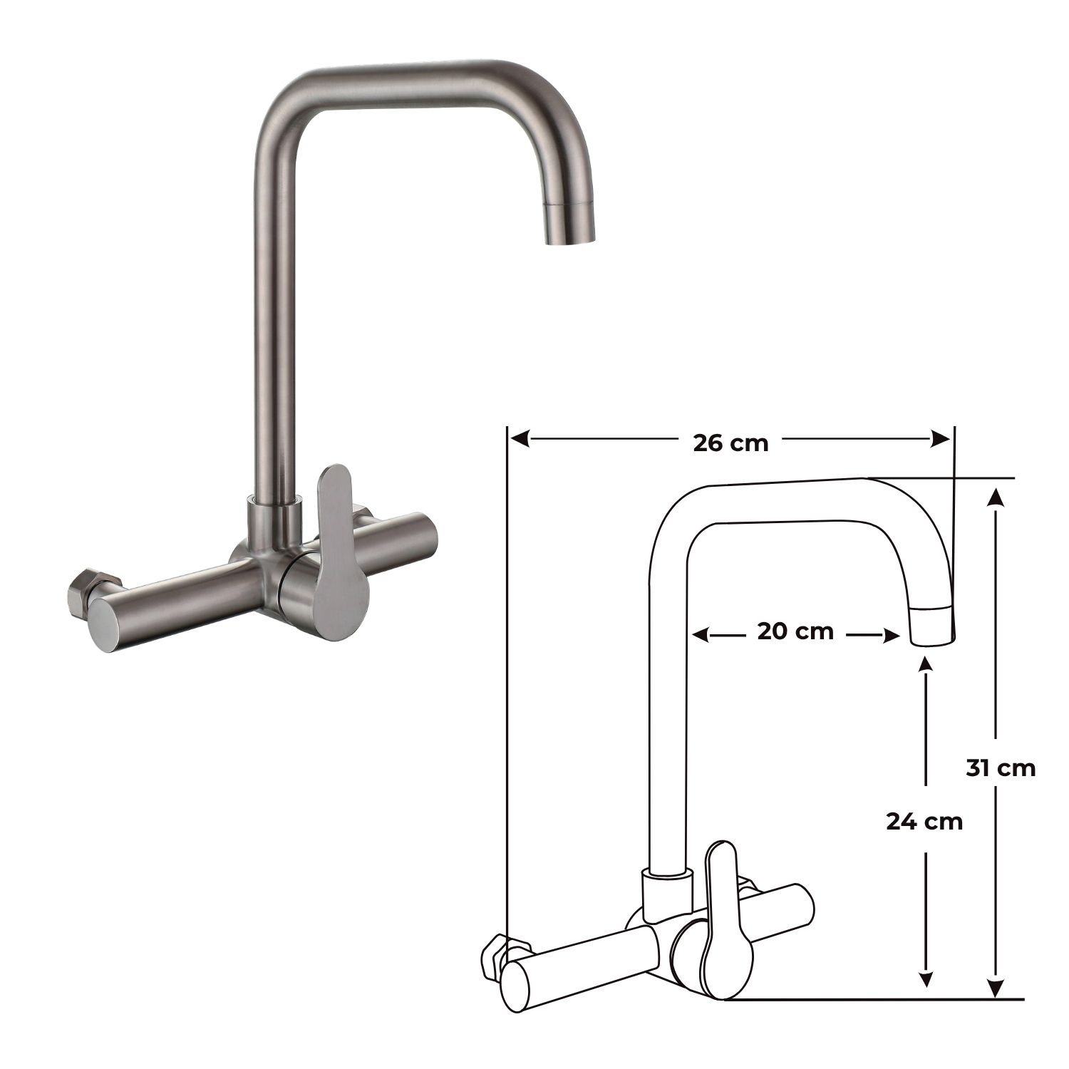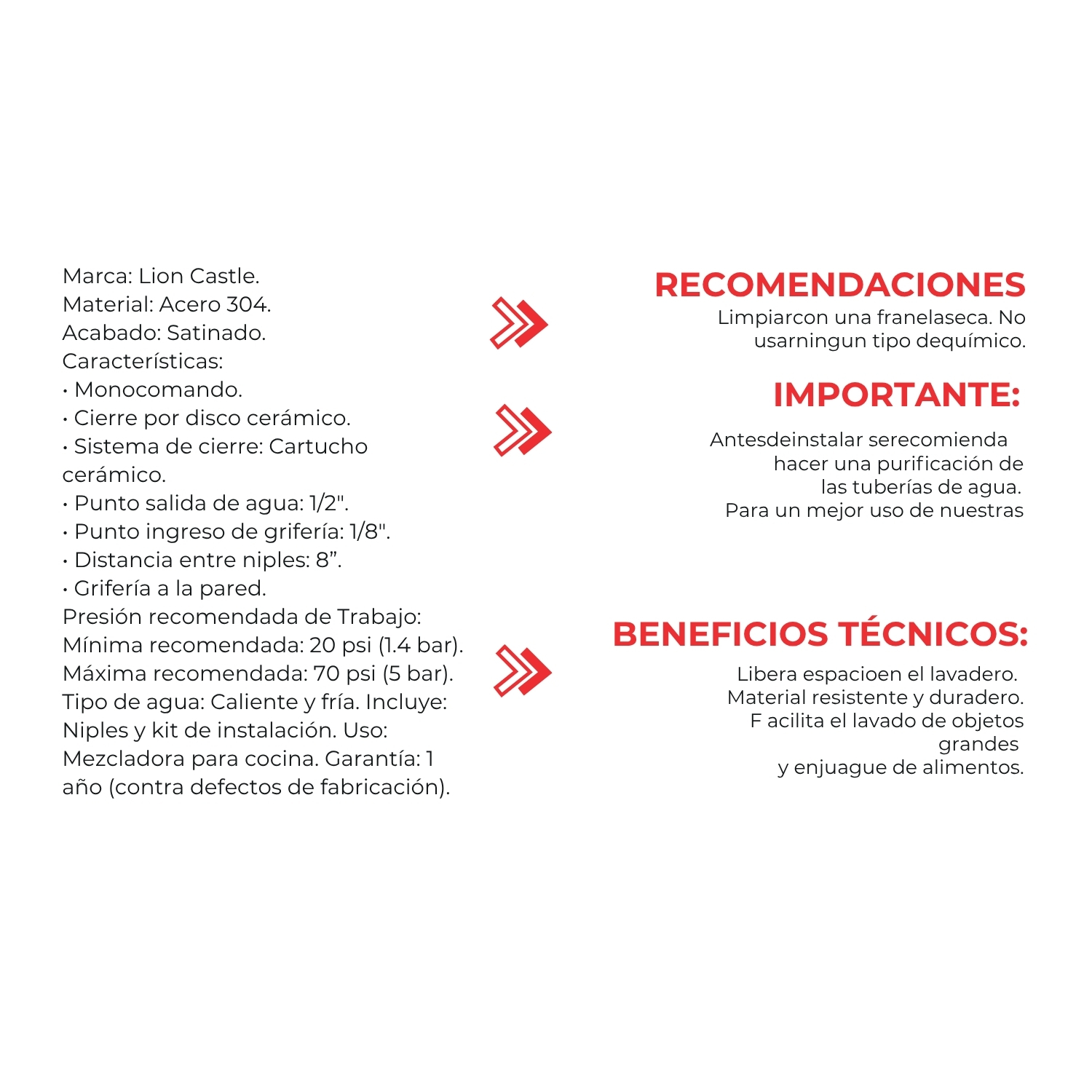 Dale a tu cocina un toque moderno y funcional con esta elegante grifería monocomando de pared marca Lion Castle. Fabricada en acero inoxidable 304 con acabado satinado, ofrece alta resistencia a la corrosión, larga durabilidad y un diseño sofisticado ideal para cocinas contemporáneas.
