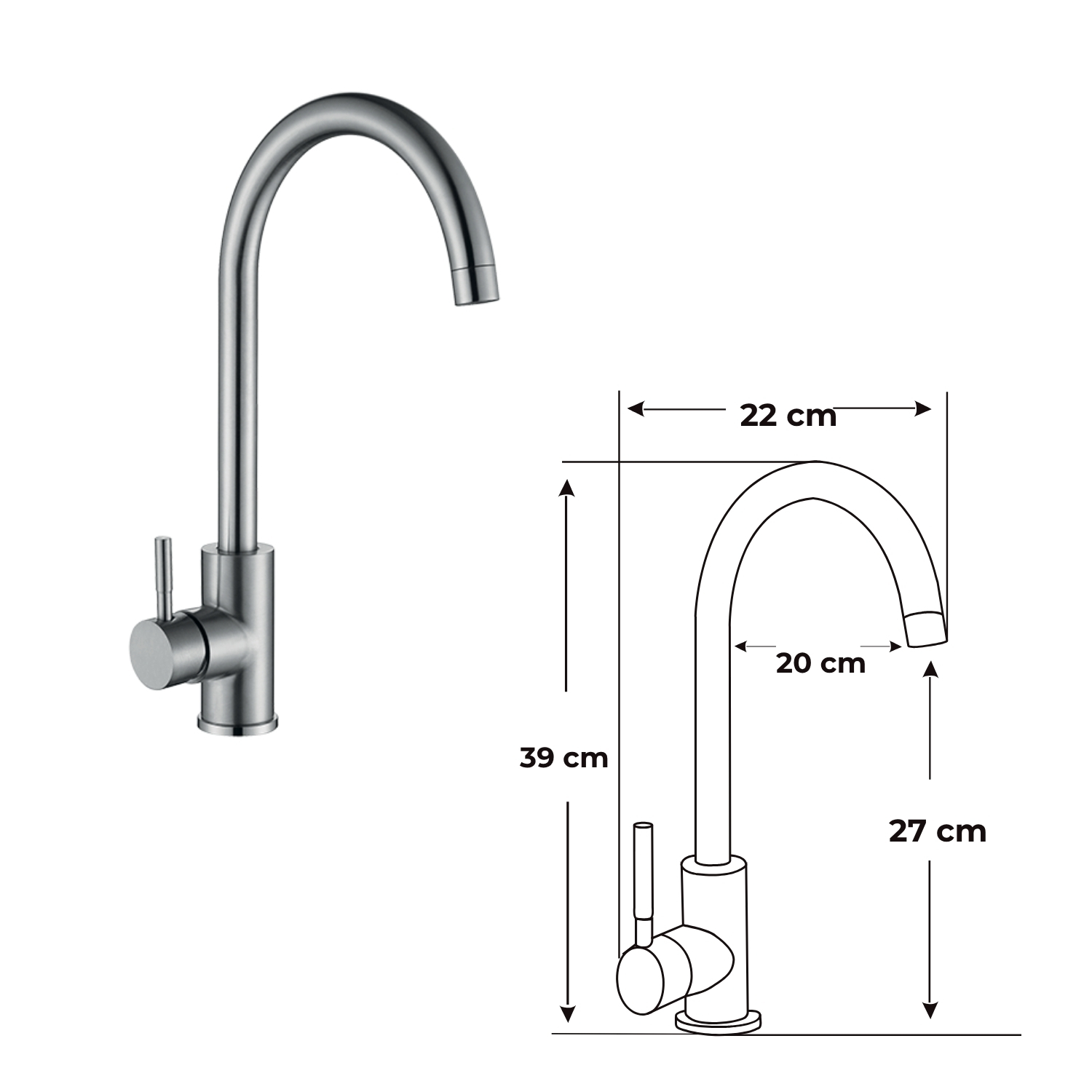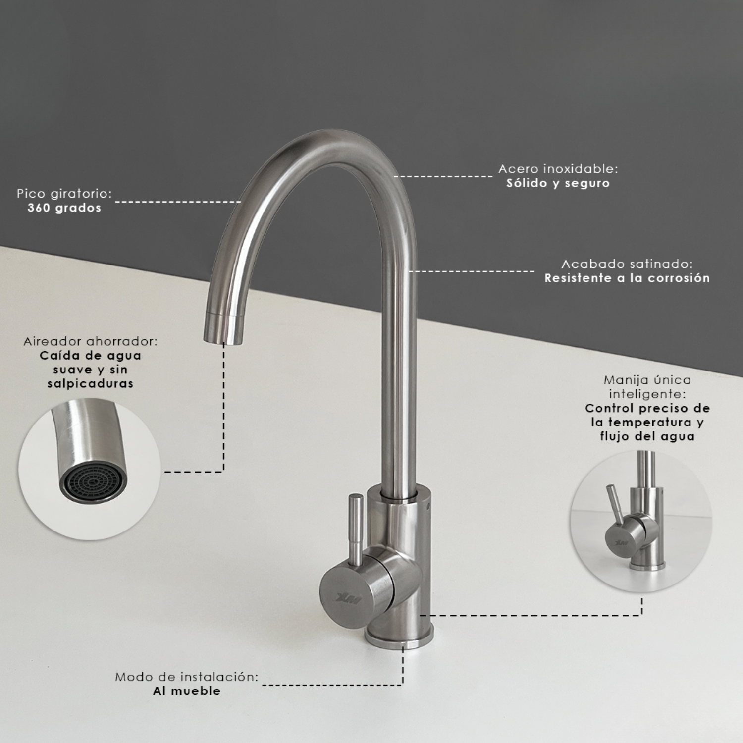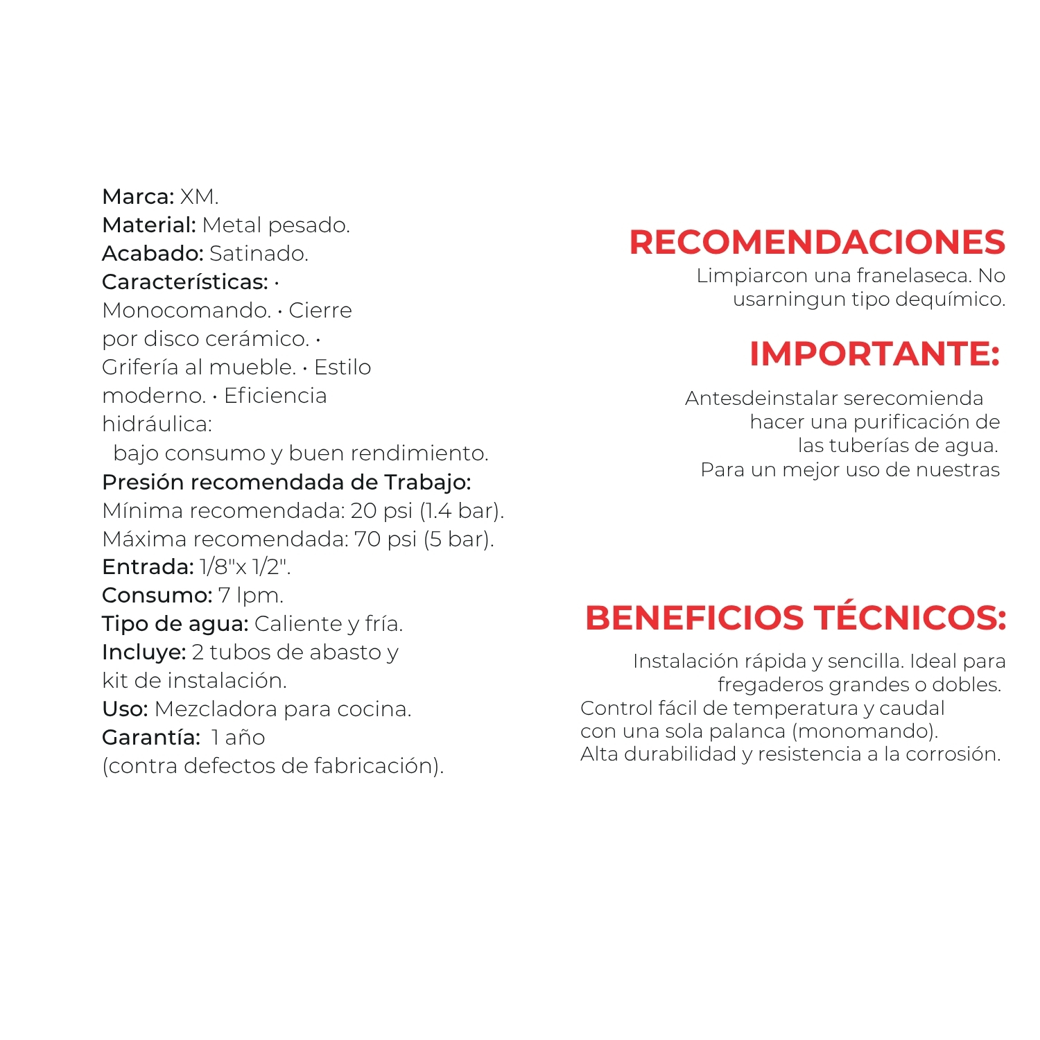 Renueva tu cocina con esta elegante grifería monocomando marca XM, fabricada en metal pesado con acabado satinado, ideal para espacios modernos que buscan funcionalidad y estilo en un solo producto.
