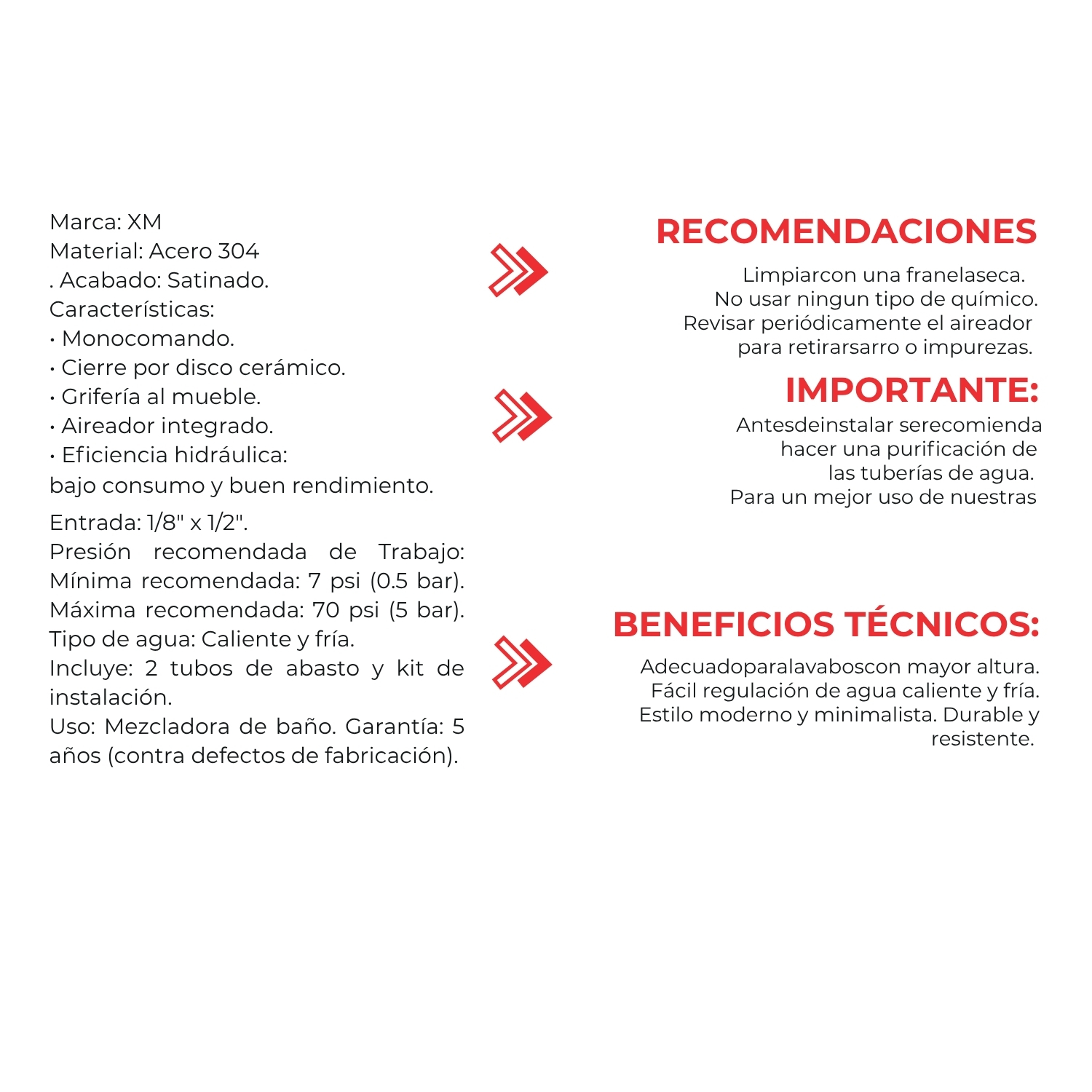 Eleva el estilo de tu baño con esta elegante grifería monocomando de la marca XM, diseñada para lavabos modernos que buscan funcionalidad y estética en un solo producto. Fabricada en acero inoxidable 304 con acabado satinado, ofrece alta resistencia a la corrosión y una larga vida útil.