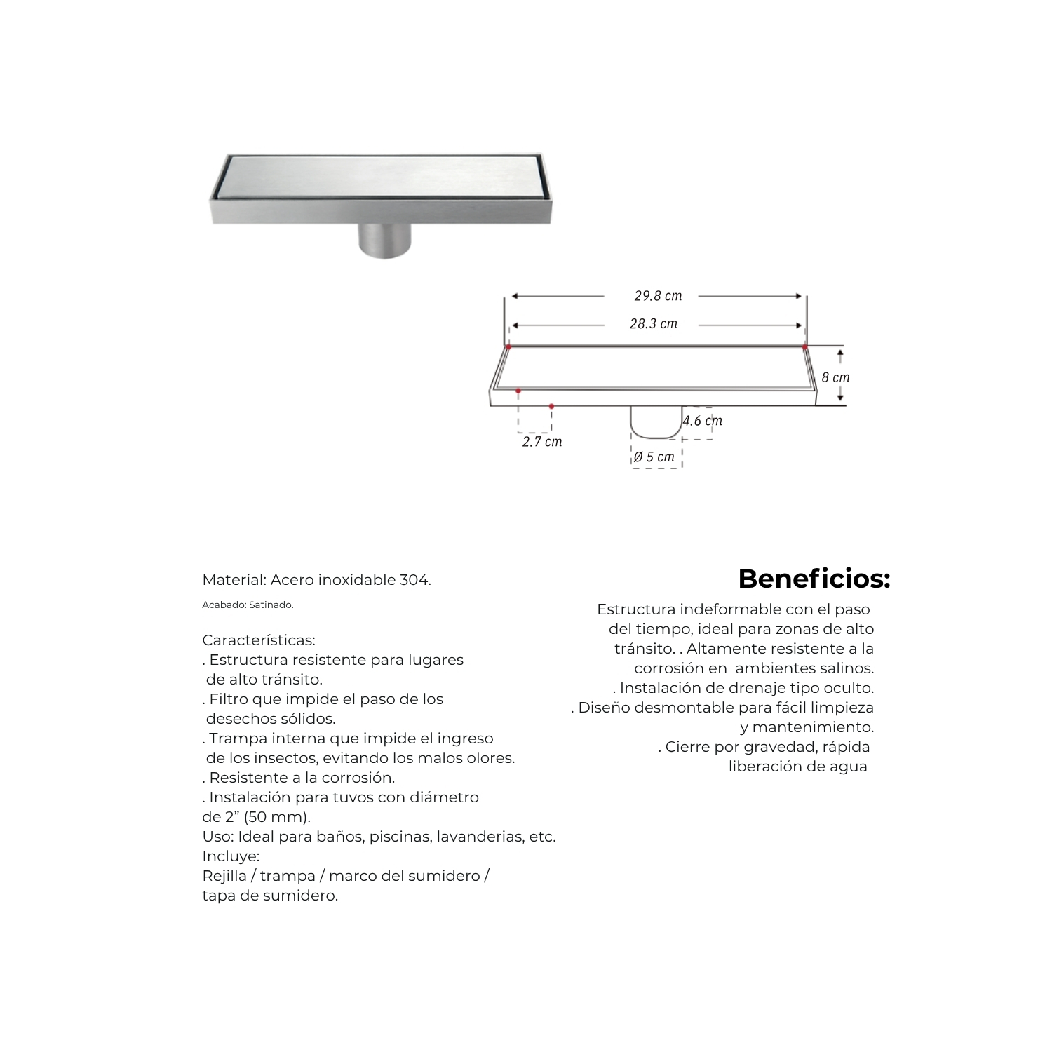 Optimiza el drenaje de tus espacios con este sumidero lineal fabricado en acero inoxidable 304 de alta calidad, ideal para zonas de alto tránsito como baños, duchas, piscinas y lavanderías. Su diseño moderno y acabado satinado no solo brinda durabilidad, sino también un estilo elegante que se adapta a cualquier ambiente.