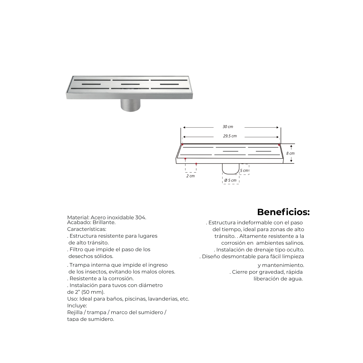 Optimiza el drenaje de tus espacios con este sumidero lineal fabricado en acero inoxidable 304 de alta calidad, ideal para zonas de alto tránsito como baños, duchas, piscinas y lavanderías. Su diseño moderno y acabado satinado no solo brinda durabilidad, sino también un estilo elegante que se adapta a cualquier ambiente.
