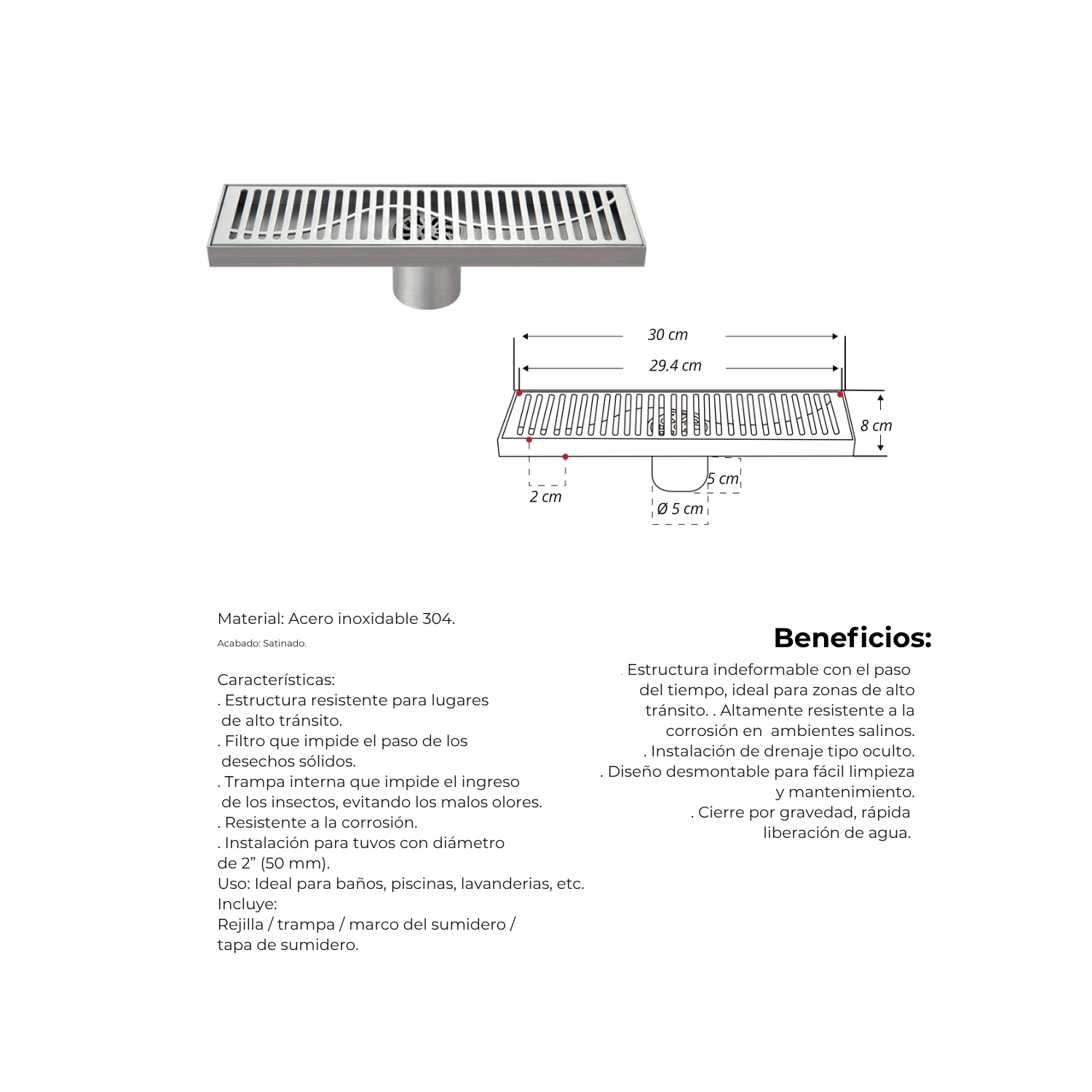 Optimiza el drenaje de tus espacios con este sumidero lineal fabricado en acero inoxidable 304 de alta calidad, ideal para zonas de alto tránsito como baños, duchas, piscinas y lavanderías. Su diseño moderno y acabado satinado no solo brinda durabilidad, sino también un estilo elegante que se adapta a cualquier ambiente.